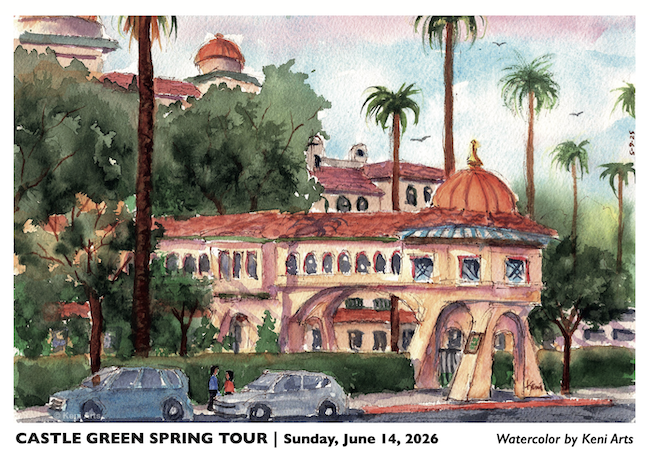 Friends of the Castle Green was formed in 1993 as a support group for the historic Castle Green built in 1898 and designed by the noted architect Frederick Louis Roehrig as the first annex to the very successful Green Hotel which had been built on the opposite side of Raymond Avenue. The purpose of the Friends was to raise funds for historic restoration to the standards of the Secretary of Interior and to raise awareness of the significance and beauty of this important building in the history of Pasadena. Over the years, mostly through public tours of the building, Friends of the Castle Green has completed many projects on the building, including work on the lanterns on the veranda and the sunroom, reproduced by the Seattle glass artist Janusz Pozniak. Earlier the Friends had the metal lanterns reproduced by local metal artisan Rinauldo’s Reproduction.Our current focus is on the restoration and painting of the three domes—two on the roof and one at the end of the bridge. Work on the bridge dome was completed in 2024. Raising funds for this project will be a multiyear endeavor.